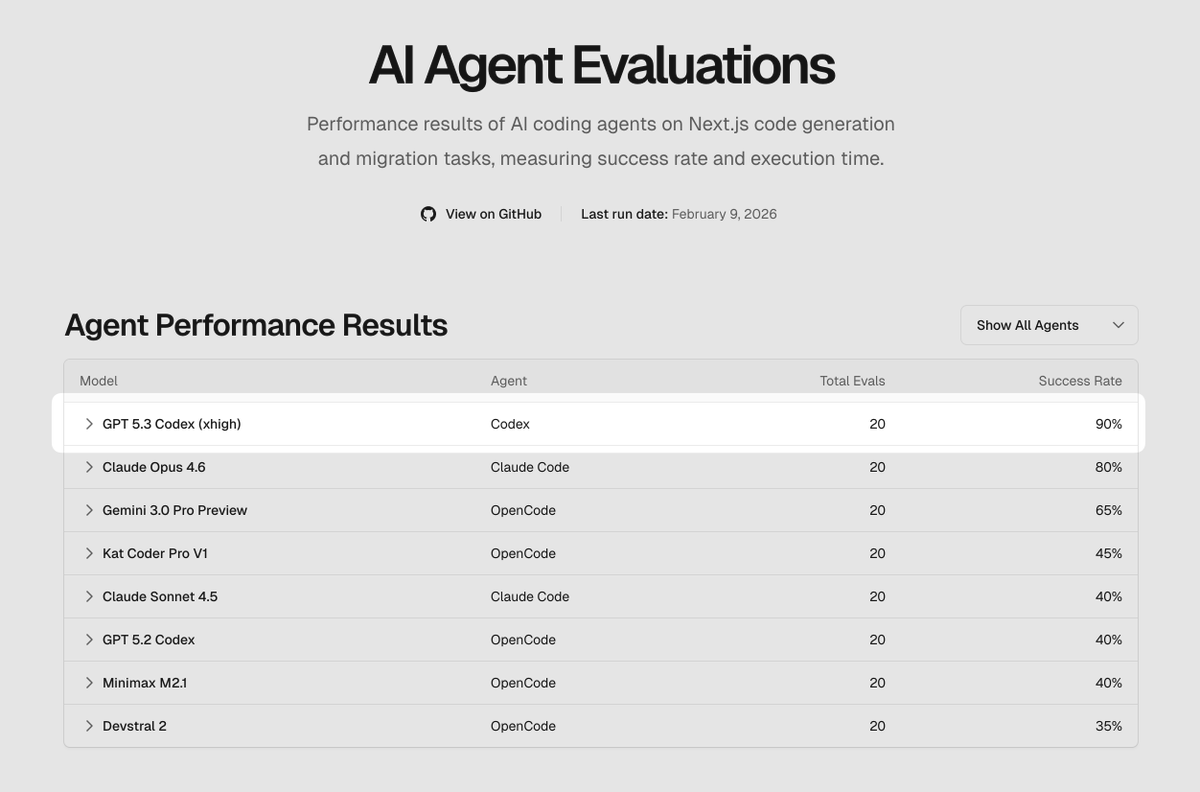 π GPT 5.3 Codex (xhigh) achieves 90% on Next.js evals out of the box, "frame-mogging" the competition so to speak: