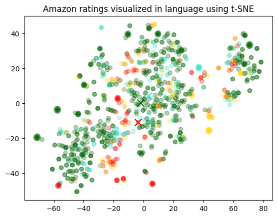 Text(0.5, 1.0, 'Amazon ratings visualized in language using t-SNE')